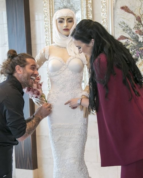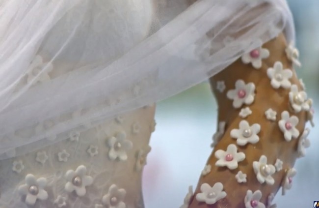 Ushbu hashamatli “kelin” ko’ylagini bezash uchun 5000 dona qo’lda kesib chiqilgan va pomadkadan yasalgan gullar, 10 ming dona yeyish mumkin bo’lgan marvariddan foydalanildi.