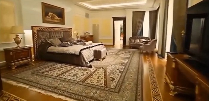 Ushbu uydagi har bir detal – qimmatbaho divandan tortib kichkinagina qutichalargacha – dabdabani bildirib turadi. Masalan, xonalardan birining shiftida milliarderning, ya’ni uy egasining ismi sharifi naqsh bialan o’yib yozilgan.