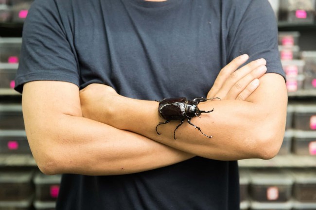 29 yoshli Li Xuanszyun Chalcosoma atlas qo’ng’izi bilan Pekin qush bozorida. Qo’ng’izning ushbu turi Malayziya va Indoneziyada yashaydi. Li – o’rgimchaklarni kolleksiya qiladi, uning uyida 2000 dan ortiq turi bor.