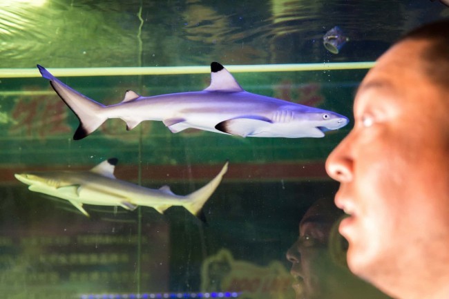 38 yoshli Szyan Vey qora patli rif akulalari akvariumi yonida. Szyan Veyning qush bozoridagi do’konida, oyiga 3-5 ta shunday akula sotadi. Ularning narxi 600 dollar atrofida. Akulaning ushbu turi Hind-Tinch okeanlarida uchraydi va ko’p tutilishi sababli qirilib ketish xavfi ostida. Szyan o’z akulalarini Filippin va Indoneziyadan internet orqali buyurtma qiladi.