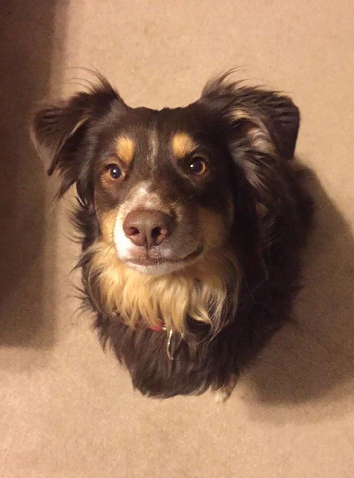Qo’rqmang, bu devordagi kuchukning qotirilgan boshi emas, shunchaki yerda o’tirgan kuchukning tepadan olingan surati.