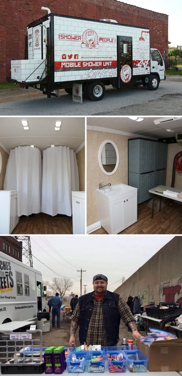 4. Bir kishi o’zining eski yuk tashuvchi mashinasini ichini uysizlar uchun dush qabul qiladigan xonaga aylantirdi. Har hafta muayyan bir joyga boradi, xohlaganlar kelishi mumkin, kerakli gigiyena narsalarini olishi mumkin, tekinga cho’milish, soqol olish va sochni kaltalatishi mumkin.