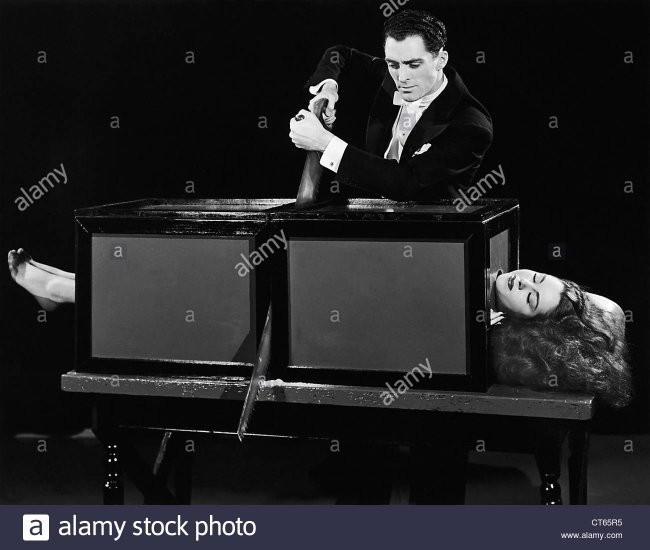 Goreys Goldin (1873-1939) bajargan “ayolni arralash” fokusi vaqtida bino atrofida “agar mabodo arra sirpanib ketsa” degan yozuvi bor tez yordam aravasi kutib turgan.