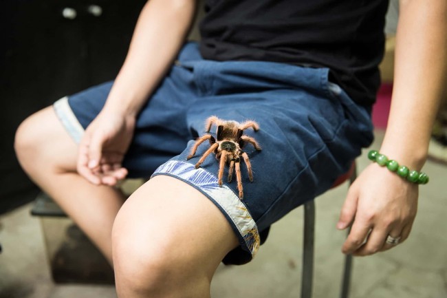 36 yoshli Chjan Bo meksika qonli tarantul bilan. O’rgimchaklarning bu turi odatda Arizona cho’llarida va Meksikaning ba’zi qismlarida uchraydi. Chjan o’rgimchaklarni 2007 yilda yig’ishni boshlagan, 2014 yilda esa ularni o’z do’konida sota boshladi.