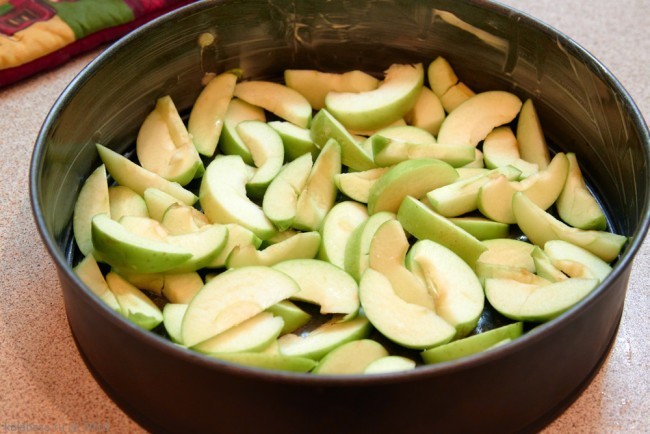Formani sariyog’ bilan surtib chiqing va suxari bilan seping. Bir qavat olmalarni forma tagiga terib chiqing.