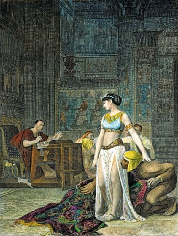 Tarixchi Plutarx aytishicha, Kleopatra o’zini qimmatbaho gilamlarga o’rab, rimlik Sezarga o’zini “taqdim etgan”.