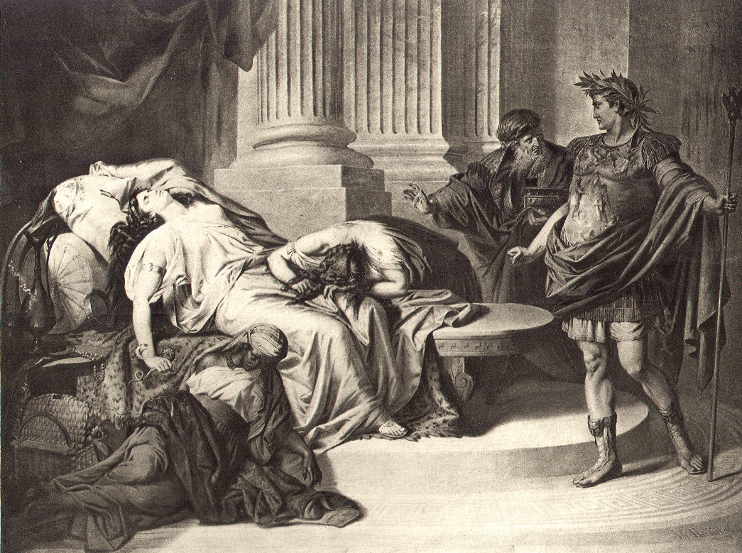 O’lim malikani Oktabian qorovullari himoya qilib turgan vaqtda kutib oldi. Uning oldig makkorlik bilan bir dehqon, qo’lida bir savat bilan kirib olgan. Aynan o’sha savatda kobra bo’lgan.