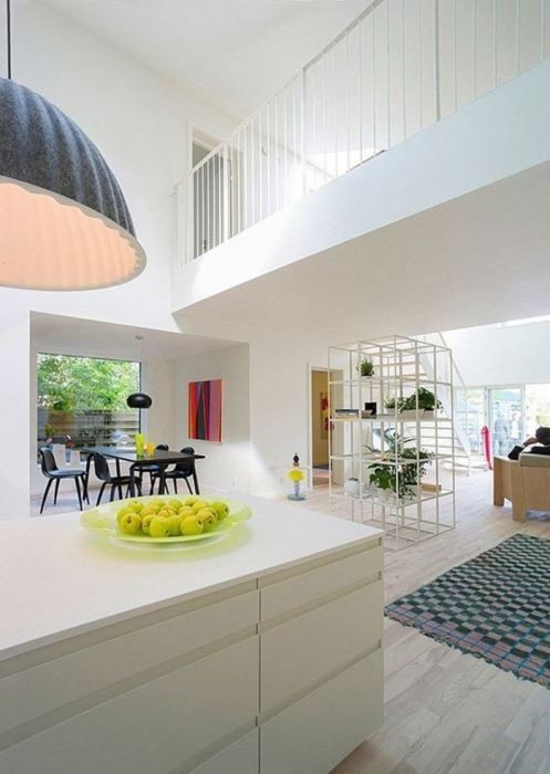 Ekologik maskanning birinchi qavatida mislsiz keng oshxona va ovqatlanish xonasi joylashtirildi. Bu sathdagi katta derazalar ichki va tashqi bo’lmalar orasidagi chegarani bilintirmaydi. Shu bilan birga dizaynerlar ikkinchi qavat to’g’risida ham qayg’urishdi!