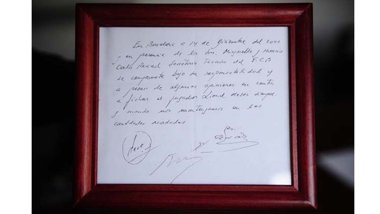 "Lionel Messi" va "Barselona" o‘rtasidagi birinchi shartnoma salfetka ustida yozilgan. Bu 2000 yilda Barselona shahridagi rsetoranlarning birida amalga oshirilgan: 13 yoshli futbolchining otasi Xorxe Messi Lionel bilan tezkor shartnoma tuzilishini qat’iyat bilan talab qilib turib olgan, shundan keyin "Barselona" klubining sport direktori Karles Reksach Messining barcha tibbiy hisoblarini moliyalashtirish va maoshini to‘lash bo‘yicha majburiyatlarga guvohlikni qog‘ozda aks ettirilishi uchun ofitsiantdan qog‘oz so‘ragan. Restoranda qog‘oz topilamagan va shartnoma har ikki tomondan oddiy salfetkada imzolangan. Hozir esa ushbu salfetka klub muzeyida saqlanib kelmoqda.