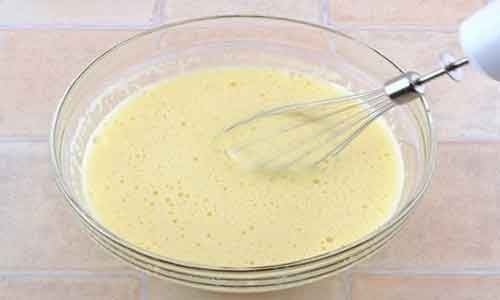 Tuxumni idishga sindiring. Ko’pik hosil bo’lgunicha aralashtiring. Shakar qo’shib turib, aralashtiring.