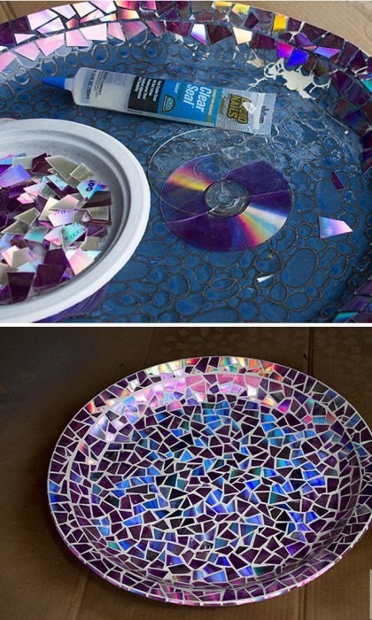 Diskni bir necha mittigina parchalarga bo’lib tashlab, yelim yordamida ularni likopga mozaika holatida yopishtirib chiqsangiz kifoya. Bunday yorqin likop oshxonadan bezak sifatida joy olishi bilan birga, undan mevalar va konfetlar uchun idish sifatida ham foydalansa bo’ladi.
