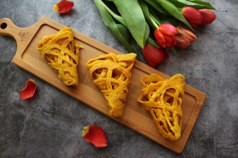 4. Xamir polietilen paket ichiga quyilgach, paketning bir uchi kesiladi. Tayyor xamir qizdirilgan o‘simlik yog‘i ustidan gul shaklidagi naqsh ko‘rinishida siqib chiqariladi.