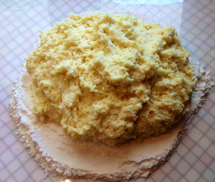 5. Qolgan un stol ustiga yoyiladi va ustiga xamir joylashtiriladi.