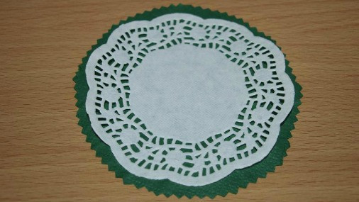 Qandolat salfetkasi shaklida qog'oz salfetkani ham kesib oling. Buni oddiy qaychida ham kesib olsa bo'ladi biroq figurali qaychida ajoyib chiqadi.